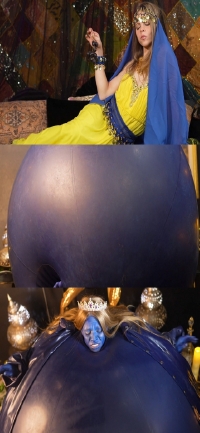Cassandra is a queen waiting for her king to return when she eats strange breed of blueberry contaminated grapes that causes blue skin and a slow transformation to a blueberry. She gets huge and tries to escape the castle to find someone to juice her. |