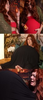 A redhaired pregnant maiden finds an apple while walking in the glen and takes a few bites & she begins to feel queasy & even more bloated. Her belly begins to expand uncontrollably to the brink of bursting. |
