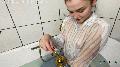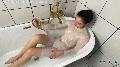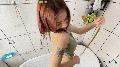 Marina taking a shower and bath fully clothed in jeans and shirt